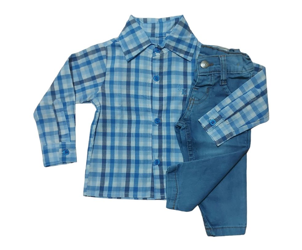 Calça jeans com regulagem de medidas na cintura, que ajustam no corpinho do bebê.